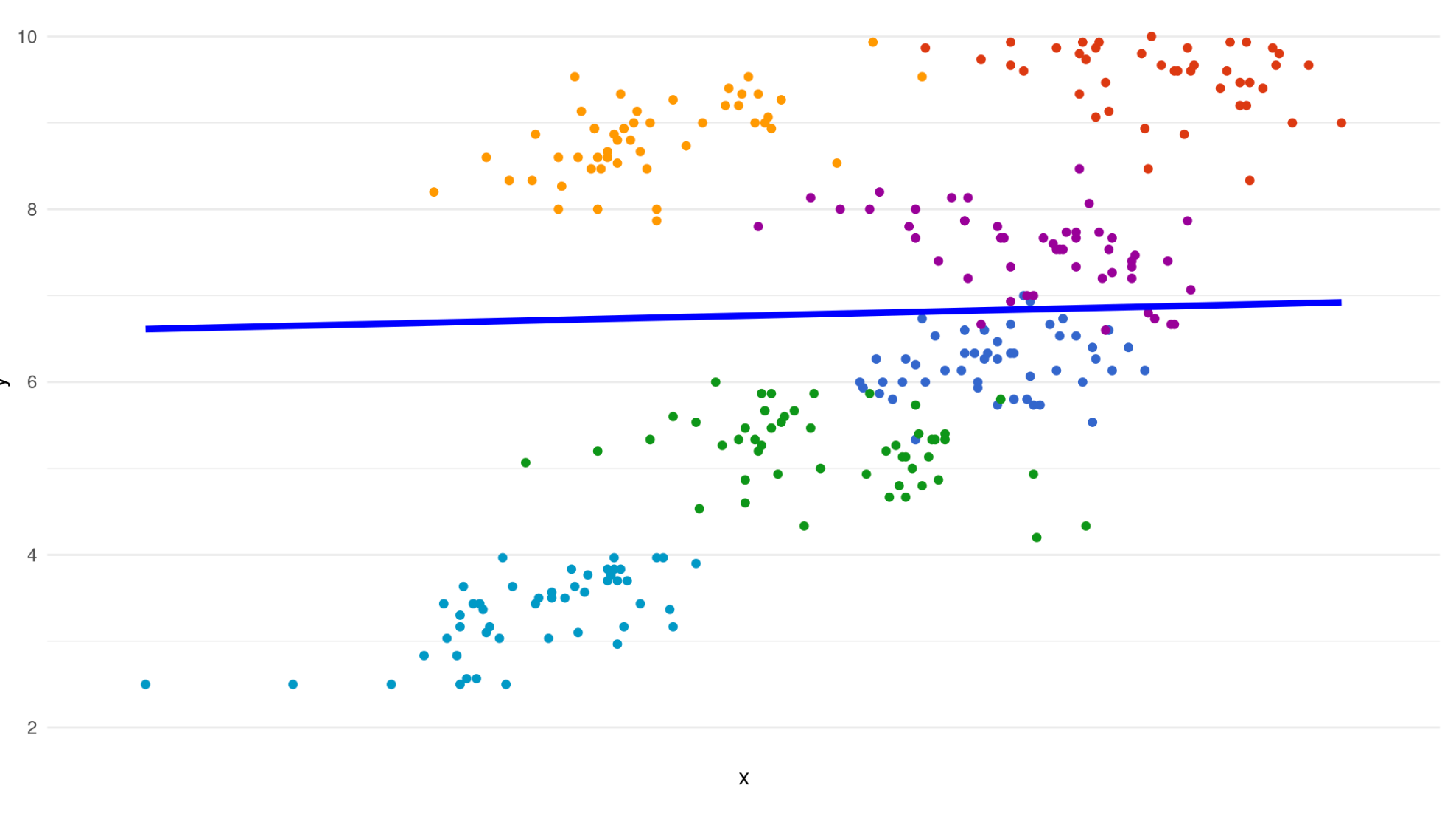 \[ y_{ij}=\gamma_{00}+U_{0j}+\beta_1x+\varepsilon \]