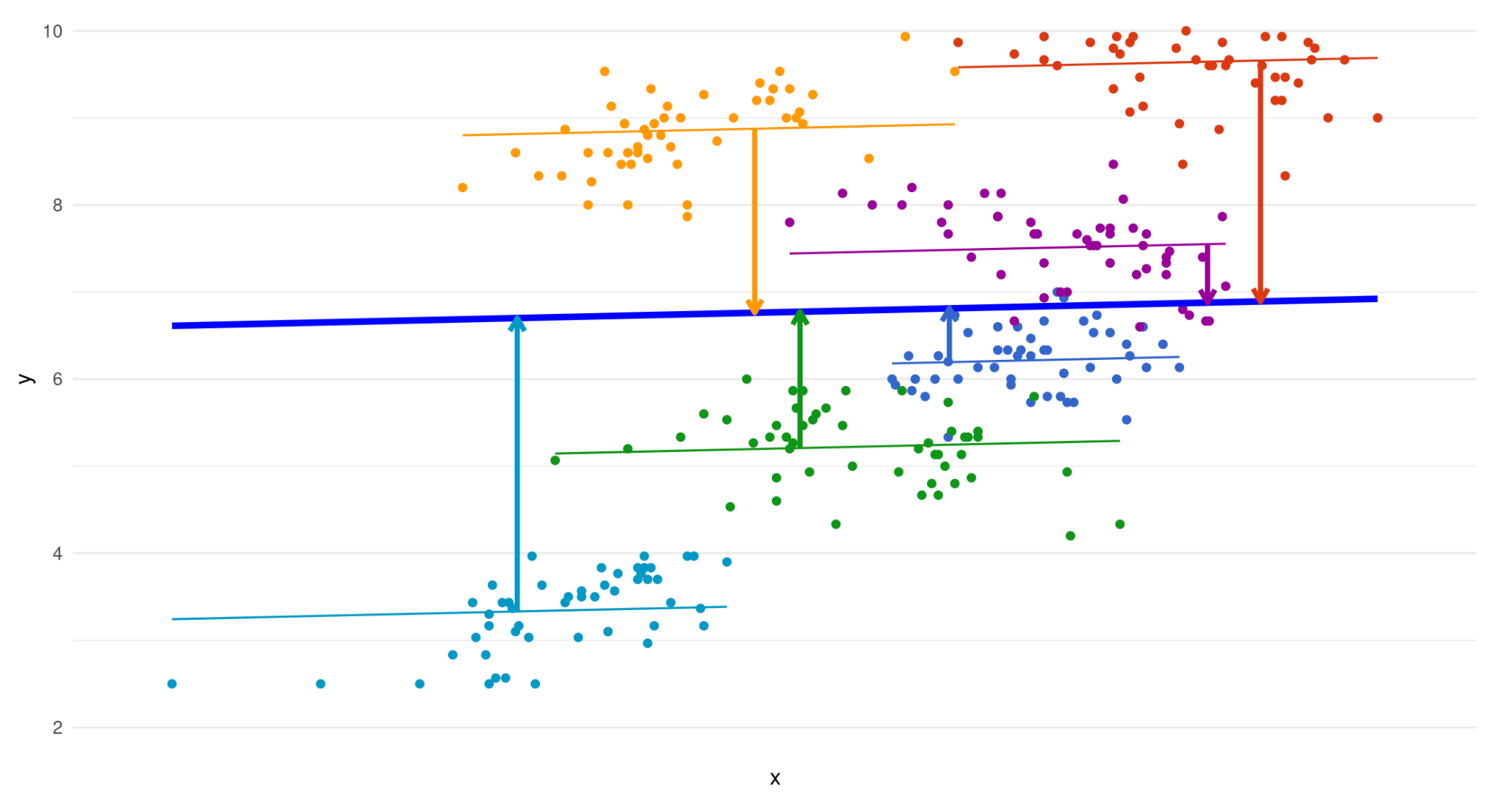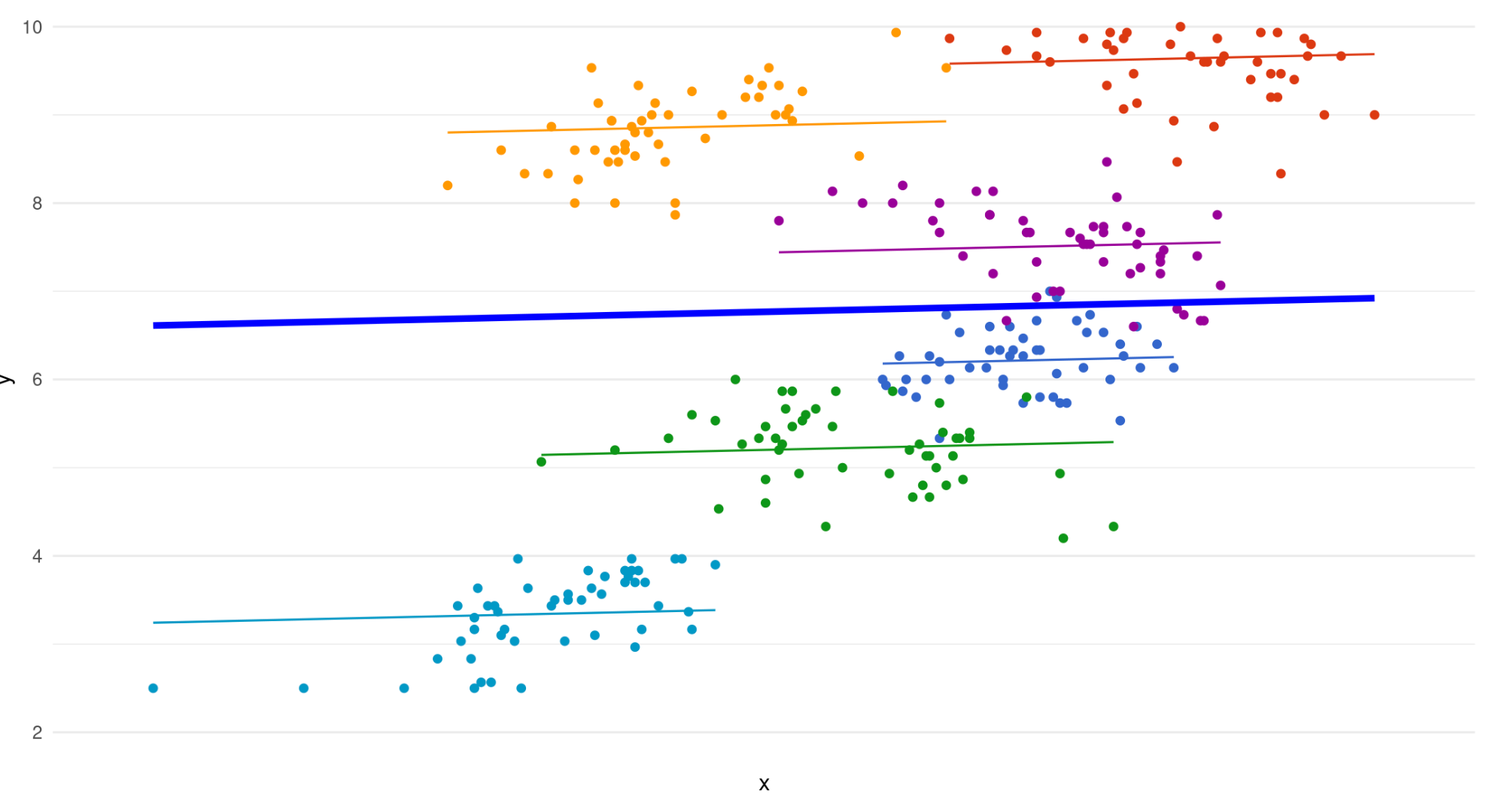 \[ y_{ij}=\beta_{0j}+\beta_{1j}x+\varepsilon_ij \]